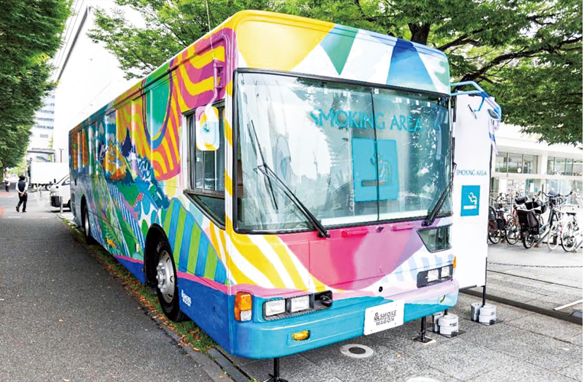 移動型喫煙所「&SMOKE WAGON」と名付けられた車両には、山や水、植物など自然をモチーフにした図柄が描かれており、一際人目を引く。車内には専用プラズマ脱臭機とファンが設置され、ゆったりと座って気兼ねなく喫煙時間を過ごせるという。