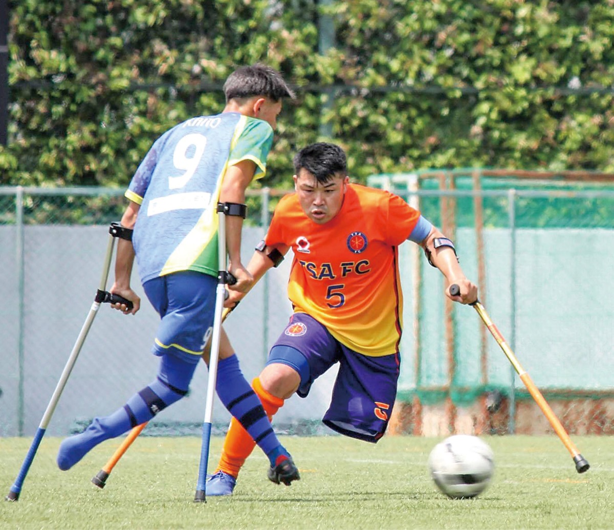アンプティサッカー(amputee soccer=切断者サッカー)とは、おもに上肢または下肢の切断障がいを持った人による7人制サッカー競技。下肢に障がいのあるフィールドプレーヤーは、クラッチという杖を支えに脚1本でボールを操り、ゴールキーパーは片腕で小学生用と同等サイズのゴールを守る。