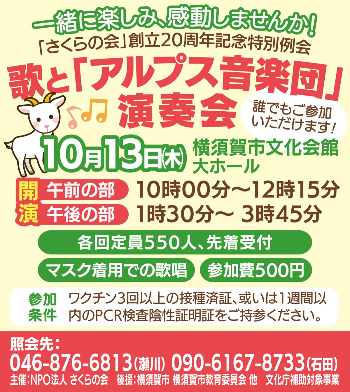 NPO法人「さくらの会」は10月13日(木)、創立20周年を記念して特別例会、歌と「アルプス音楽団」演奏会を横須賀市文化会館で開催する。2部制(午前の部10時開演・午後の部13時半開演)。各回定員550人先着順。参加費500円(歌集付)。予約不要。マスク着用での合唱。同会は横須賀の高齢者を中心に、皆で一緒に歌う会で会員は約3000人。この特別例会では「アルプス音楽団と楽しもう」をコンセプトに、秋らしい歌などを11曲うたう。また、ヨーデル歌手の特別参加も。「アルプス音楽団は創立20年の歴史の中で最も楽しく感動的な楽団です」と担当者は話す。アルプス民族楽器の巨大なアルプホルンの爽やかな3重奏も必聴。会員でなくとも誰でも参加可能なので直接会場へ。問い合わせは気楽に。