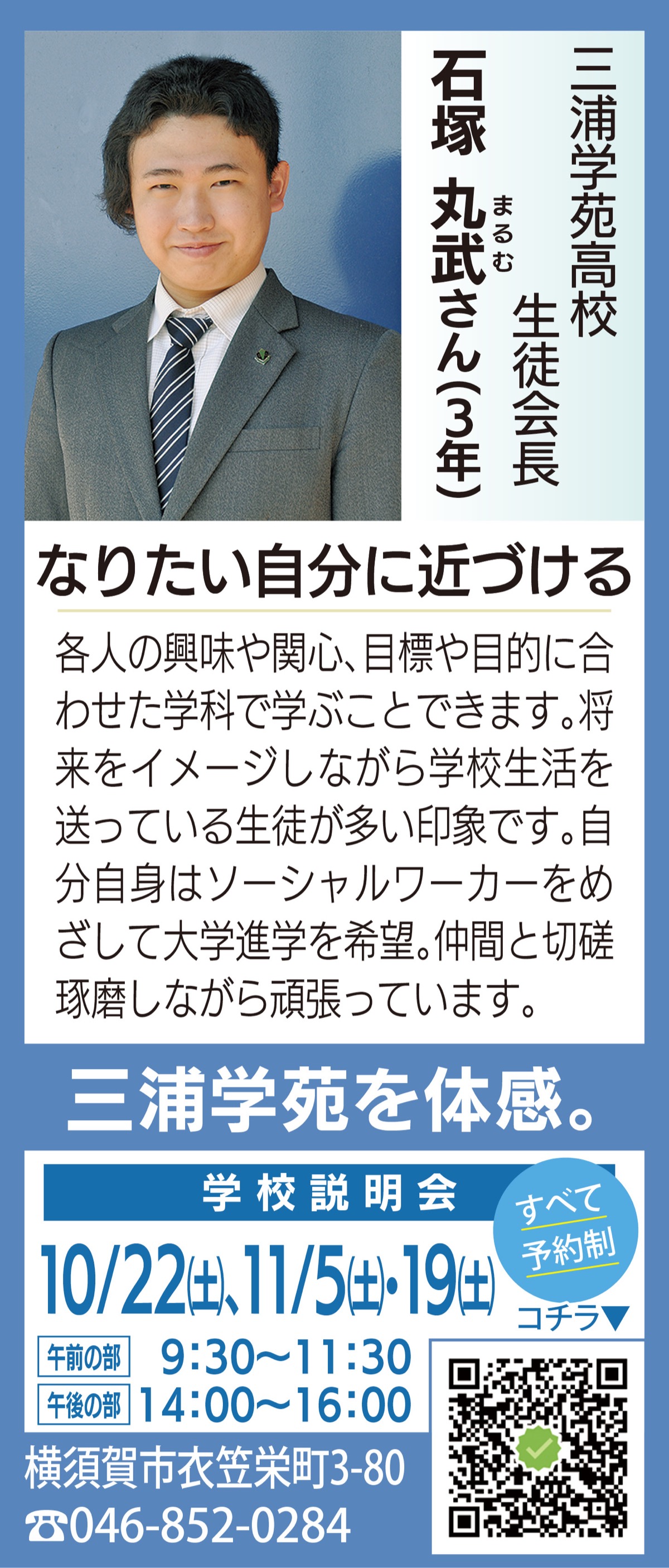 三浦学苑が掲げる教育目標は「個性と自主性を持った国際人の育成」。生徒自身の希望と適性に応じた進路を実現するための学科が設けられており、将来の支えとなるような3年間を過ごすことができる。普通科は難関大学を狙う「特進」、英語の習得に力点を置きながら多文化共生の精神を身につける「IB(国際バカロレア)」、勉強と課外活動を両立させながら現役合格をめざす「進学」、3年間で進む道を探す「総合」の4コース。工業技術科には、実用技術を修得する「ものづくり」、開発・設計などの工業デザインを学ぶ「デザイン」の2コースがあり、将来の職業を視野に入れた学びを深めることができる。