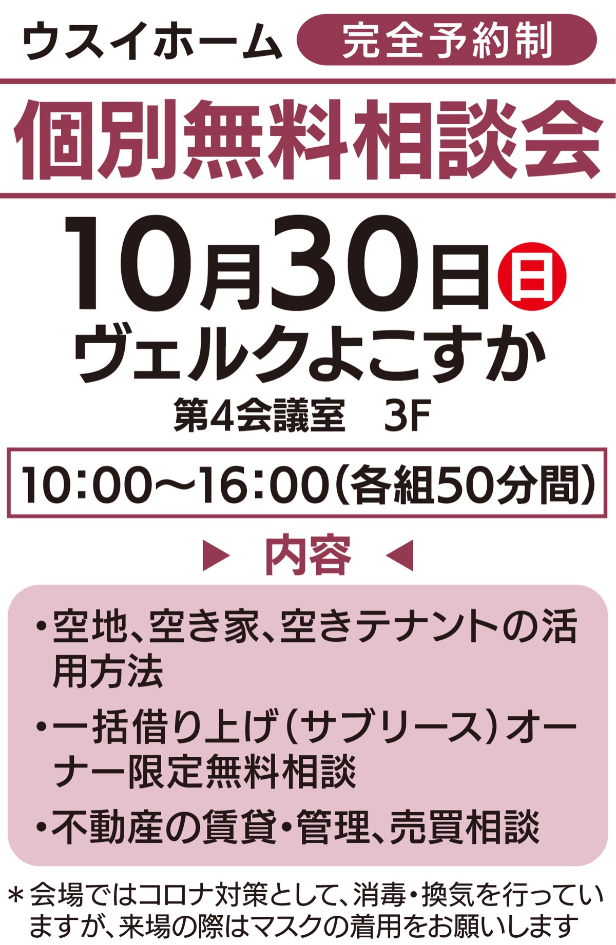 横須賀・横浜・湘南を中心に県内で不動産事業を展開するウスイホーム(株)は10月30日(日)、ヴェルクよこすかを会場に相続に関連した個別無料相談会を実施する。