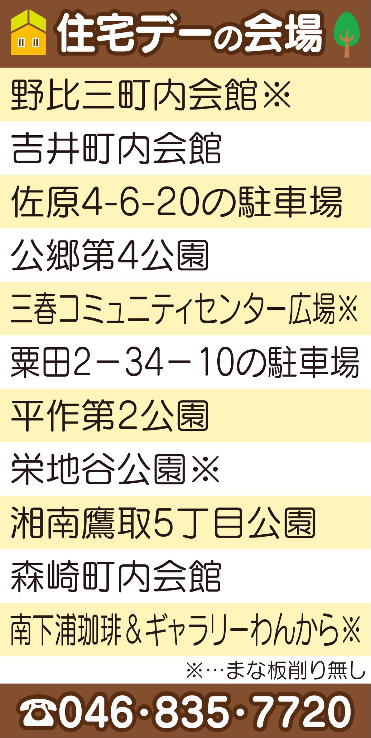 住宅に関する相談が無料でできる「住宅デー」が10月30日(日)、市内公園や町内会館など11カ所で開かれる。午前9時から11時30分。工務店や大工で組織する神奈川土建横須賀三浦支部の主催。