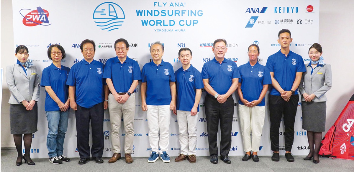 大会スポンサーである全日本空輸(ANA)、京浜急行電鉄と日本ウインドサーフィン協会、神奈川県、横須賀・三浦の両市による共同記者会見が10月13日にあった=写真。大会期間中の来場目標を6万人として、オンライン配信も行うことが発表された。