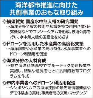 横須賀市は、まちづくりの1つに掲げる「海洋都市推進」に向けた産官学と金融機関の共創事業を来年からスタートさせる。企業版ふるさと納税を財源に、水中ドローンを中心とした海洋関連のテクノロジーを活用して、技術開発や人材育成、水産業の活性化を図るほか、脱炭素社会の実現をめざす。