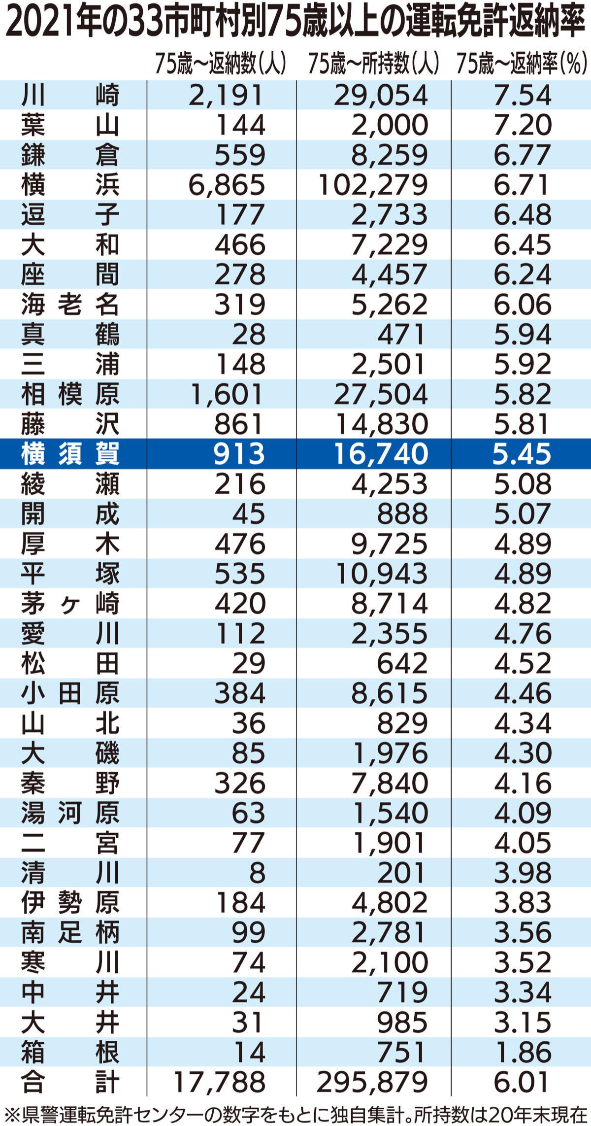 75歳以上の後期高齢ドライバーの運転免許返納状況についてタウンニュース社はこのほど、県内33市町村を対象に調査した。横須賀市で2021年に自主返納したのは免許所有者(75歳以上)の5・45%にあたる913人。返納率は県平均を下回り、自治体間では最大4倍の地域差があることも明らかになった。県警運転免許センターの統計をもとに独自集計した。