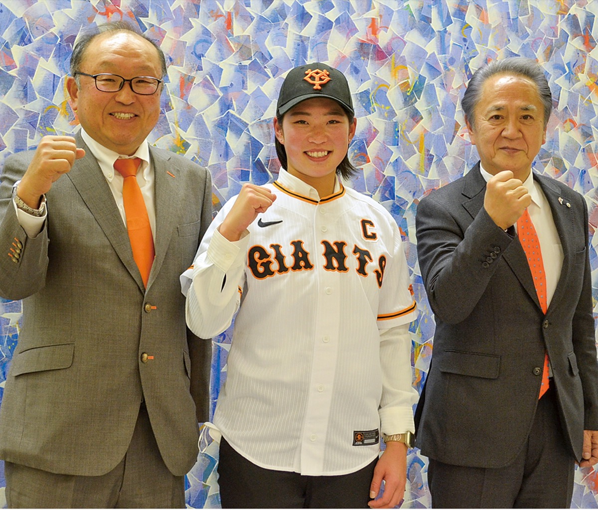 女子硬式野球クラブチーム「読売ジャイアンツ女子チーム」所属の金満梨々那さん(岩戸出身)が1月19日、上地克明市長を表敬訪問した。