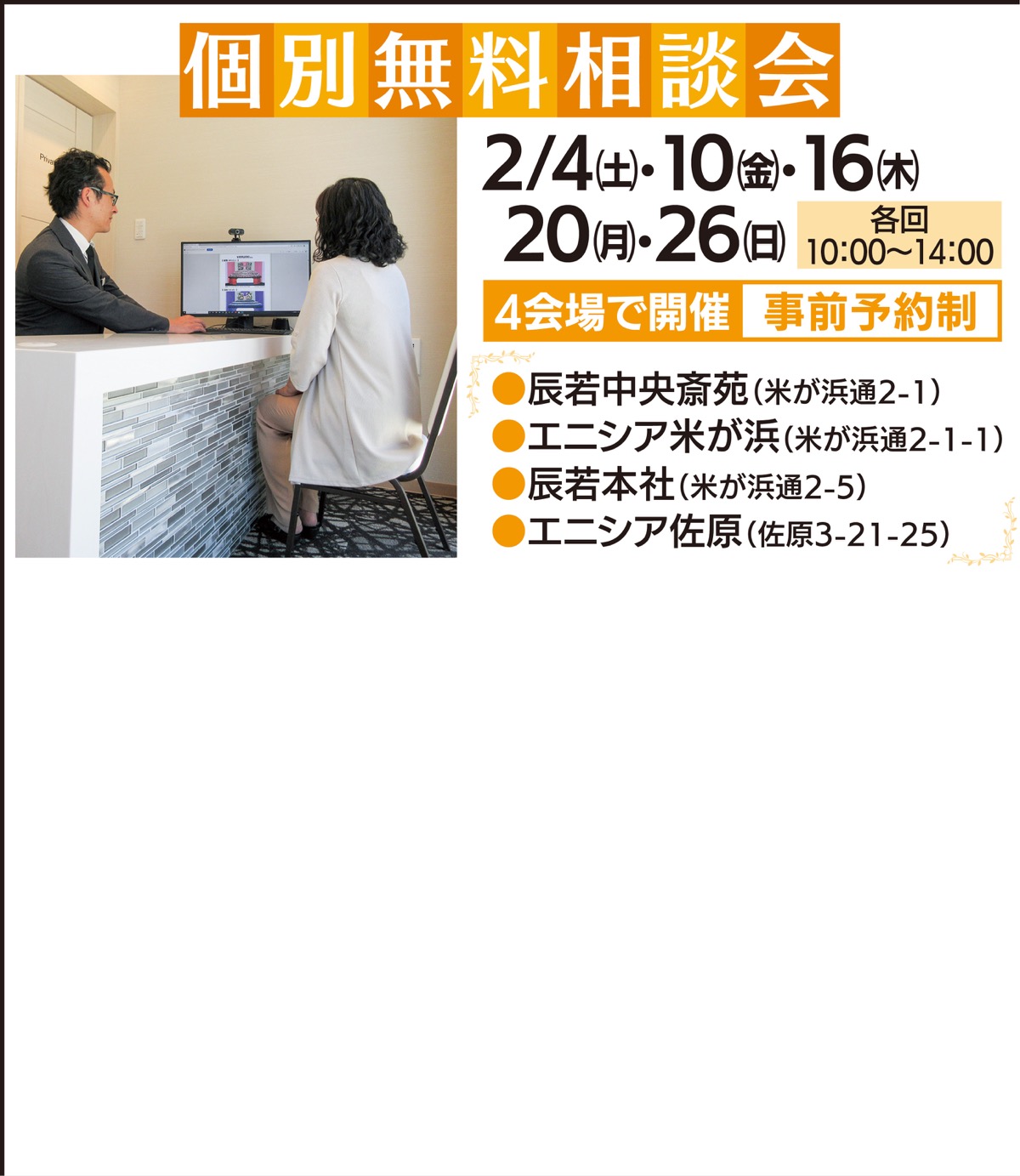 故人と親しかった人たちだけで行う「家族葬」、通夜を省略した「1日葬」、火葬のみの「直葬」など、葬儀にまつわる疑問や質問に応える「個別相談会」を2月4日(土)・10日(金)・16日(木)・20日(月)・26日(日)の日程で実施する。費用無料。辰若中央斎苑、エニシア佐原、辰若本社、エニシア米が浜の4会場。時間は午前10時から午後2時で事前予約制。
