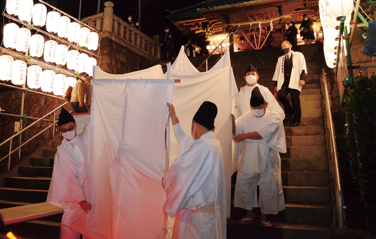 しんとした厳かな雰囲気の中、提灯や松明が先導して氏子や地元住民ら約60人の隊列とともに、「絹垣」と呼ばれる白い布で周囲を覆われた祭神が大津の町内をゆっくりと渡御した=写真。
