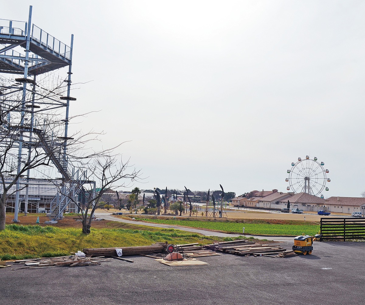 観覧車やどうぶつ村、ほたるのせせらぎ、ロードトレインなどの園内既存コンテンツは継続して活用。新たに設置される遊具の目玉は、高さ15m級の大型アスレチックと全長約300mのジップラインだ。花畑を見渡しながら雄大な空を体感できる仕掛けを設けた。さらに、グランピングやオートサイト・フリーサイトなど、キャンプ施設も拡充してアウトドアレジャーの需要に応えていく。また、花畑の面積も5haから10 haに拡張。芝生広場は大型フェスの会場やフリーキャンプサイトとして活用できるようにする。