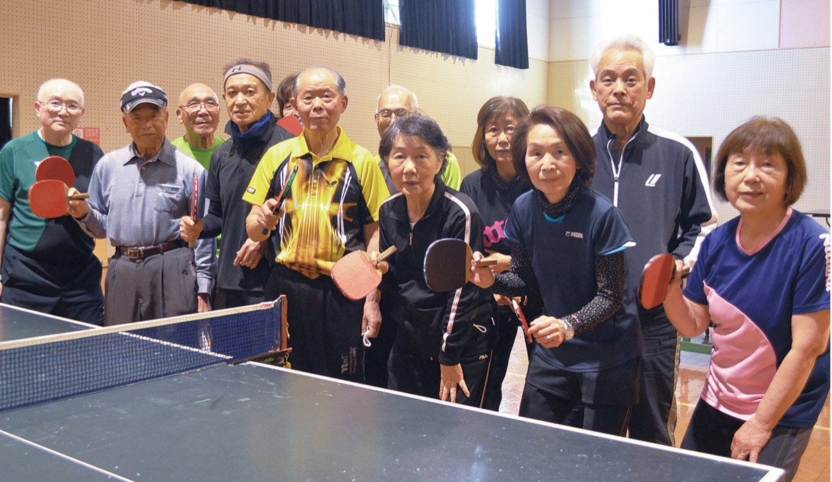 最高齢88歳の小林一博さん(望洋台)は現役時代、企業の卓球部主将を務めていたという。「通っていたパソコン教室の文書課題で『趣味は卓球』と書いたら、それを見かけた人に誘われて」と笑う。今は卓球と月に数回のゴルフが健康維持の秘訣。「前後左右に動くので、体幹が鍛えられる。ゲームは頭も使うし、早いボールを追うための動体視力も必要だよね」と小林さん。日々の練習はダブルスが中心で「個人の対戦では勝ち負けにこだわりすぎてしまう。(ダブルスの)相手を変えながら、卓球そのものを楽しめる場づくりを考えている」と酒井さん。「運動して汗を流すことで元気でいられる。良い”卓球仲間”という関係性もちょうどいい」と笑顔を見せる。