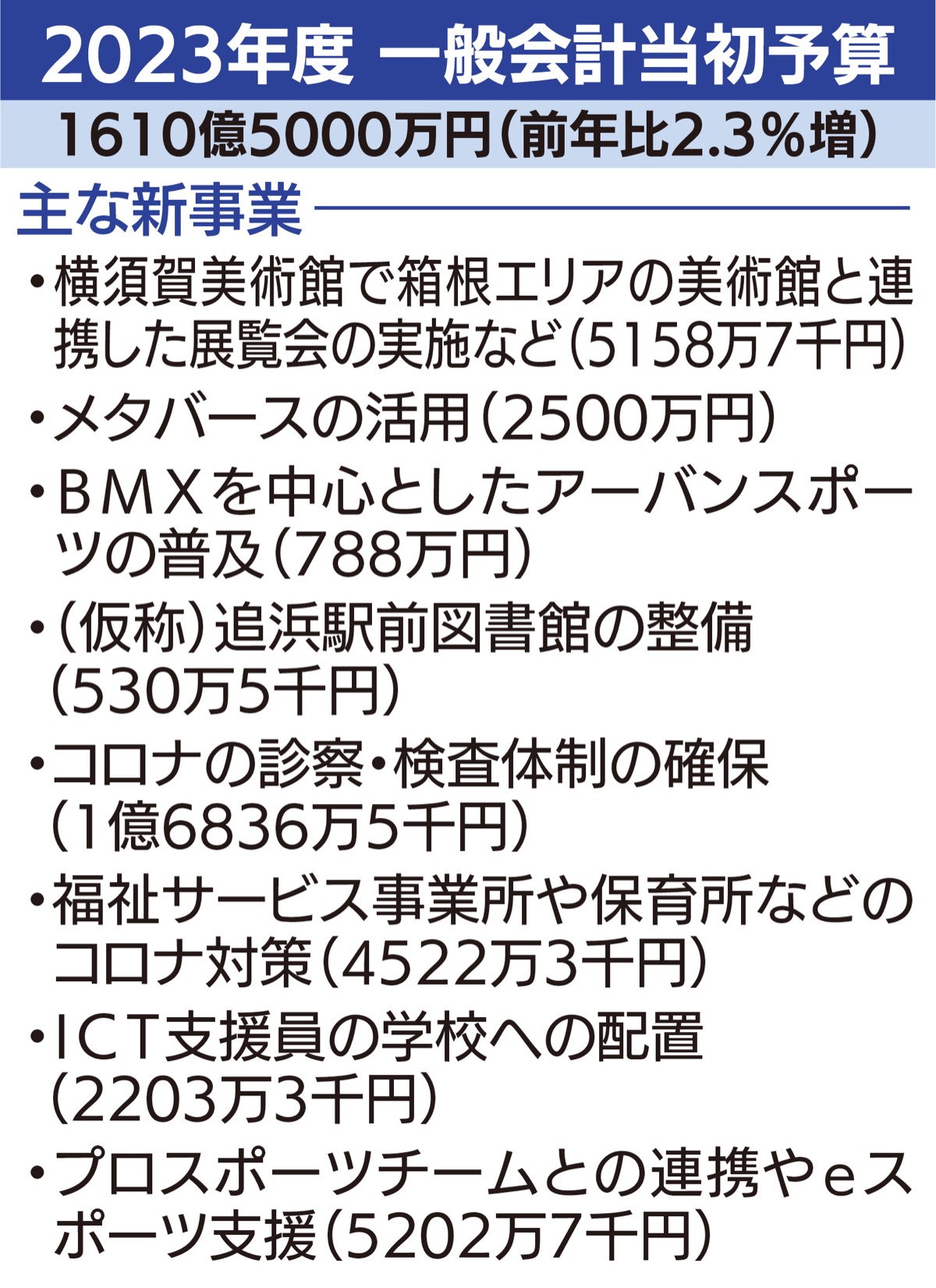 横須賀市の上地克明市長は2月10日、2023年度当初予算案を発表した。市民サービスの提供や行政運営の経費となる一般会計は1610億5千万円、前年度比で36億円増額(伸率2・3%)となり、過去3番目の規模となった。同月14日に開会した市議会に提出され、審査が行われている。