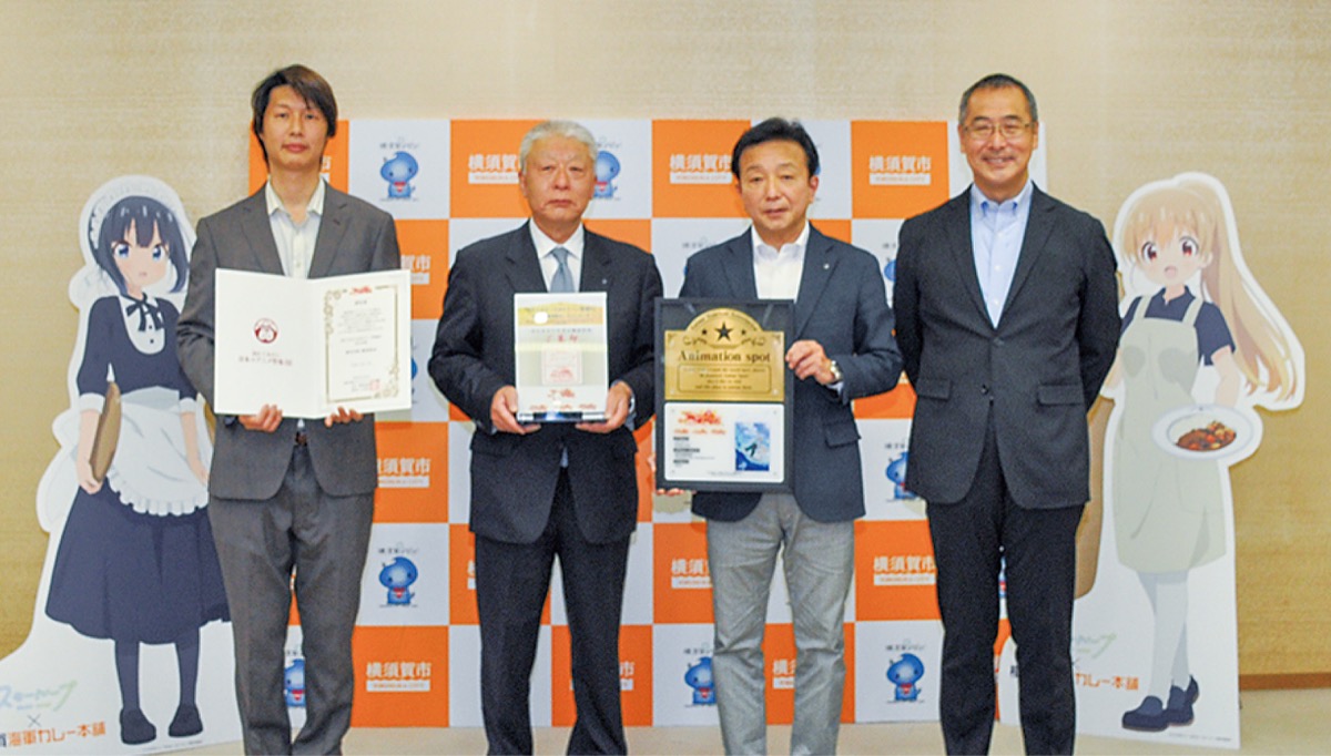 3月1日には、横須賀市役所で認定プレートの贈呈式が開かれた=写真。聖地の選考基準は、作品の知名度だけでなく、作品の権利者や当該自治体が一体となってファンを呼び込むための取り組みを行っていることがポイントとなる。『スローループ』は、市と民間事業者がつくる「サブカル活用推進委員会」が連携してグルメラリーや釣りの体験イベント、高校生とコラボした缶詰の販売などでファンを迎えたことが評価を受けた。