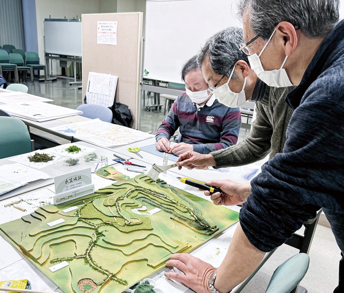 メンバーが三浦半島にあるゆかりの地を歩き、三浦氏の歴史などを平易にまとめて紹介する。矢部村絵図や衣笠城址ミニチュアジオラマの展示=写真=のほかオリジナル動画も視聴できる。