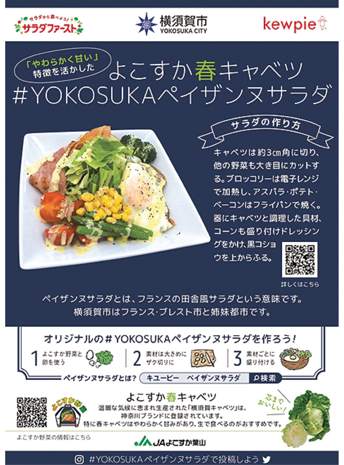 春キャベツシーズンの3月、市はJAよこすか葉山、キユーピー株式会社と協業で「YOKOSUKAペイザンヌサラダ」のレシピを開発した。野菜の消費促進や情報発信で意気投合した両者のコラボレーション第一弾で、春キャベツをメインにしたサラダ。地元野菜の新しい食べ方を提案し、消費を後押しするとともに、地産地消による地域の活性化も狙う。今後、市はPRポップ=写真=を市内外のスーパーなどで掲示するほか、SNS上で「#YOKOSUKAペイザンヌサラダ」の投稿キャンペーンも展開していくという。