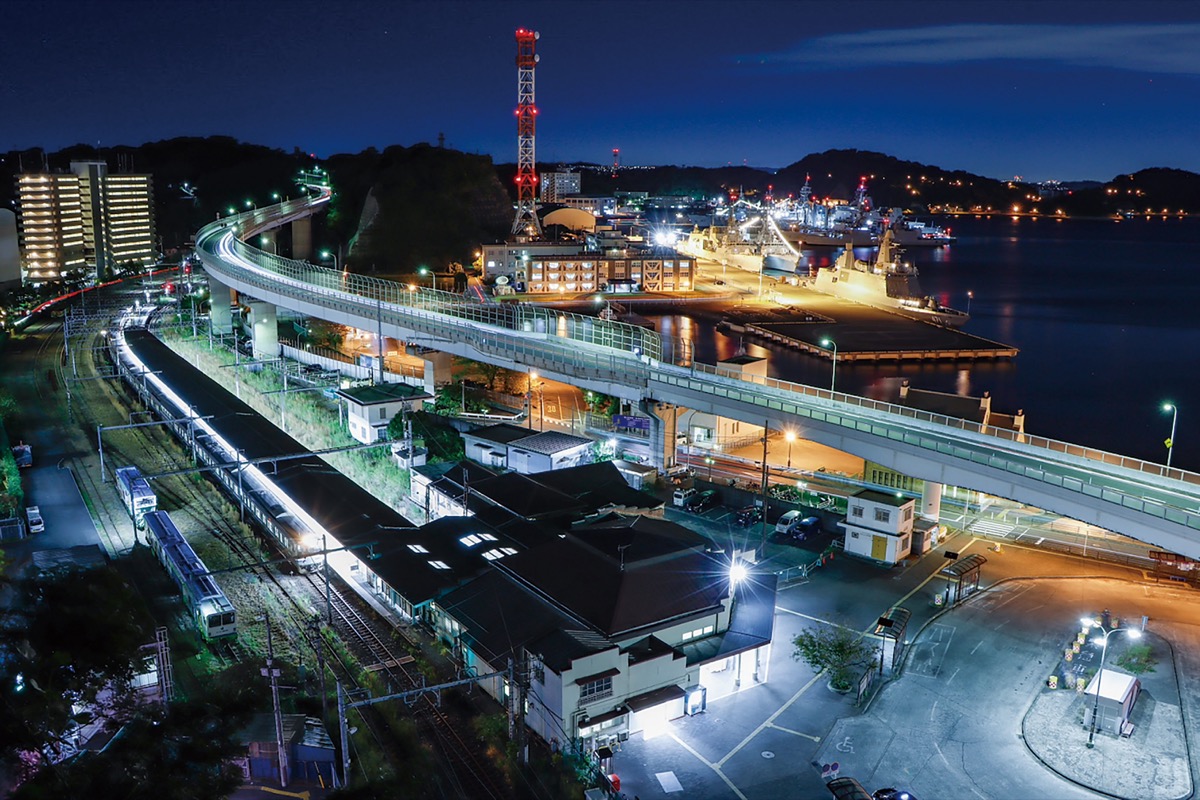 大倉さんの作品タイトルは「横須賀駅と海上自衛隊」。昨秋、横須賀港で行われた海上自衛隊創設70周年記念国際観艦式と廃車が進むJRの車両「E217系」を同時に写し出すとともに日没直後の軍港風景をSFチックに表現した。審査員からは「構図と鮮やかな色合いが絶妙。横須賀らしさやスケール感も伝わる」と高い評価を得た。