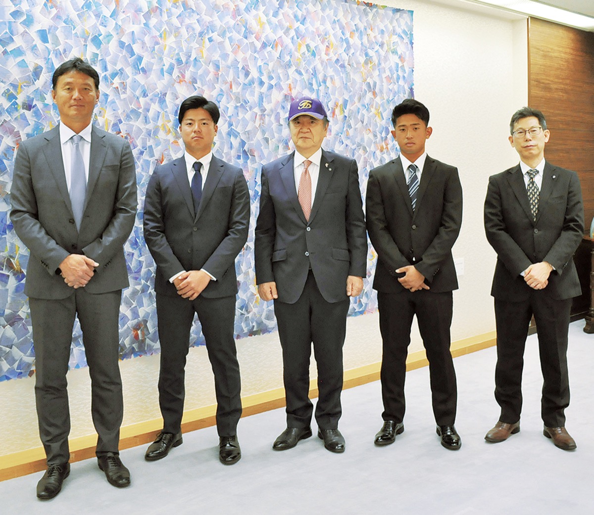 この日は、市内在住の武内勇賢(ゆうけん)選手(22)=写真右=と星野翼選手(18)も顔を揃えた。2人はともに今シーズンからの加入。