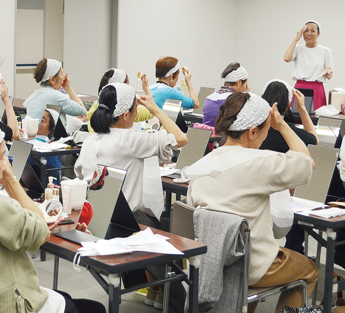 センターの事業紹介が終わったあと、約15人の参加者は資生堂ジャパン(株)の講師の指導で、手軽に実践しやすいスキンケア法とファンデーションや眉の描き方といったメイクのコツを学んだ。「見た目の華やかさや気持ちが明るくなるだけでなく、メイクが筋力アップや脳の活性化など健康維持にも効果がある」と講師の邉見千絵さん。コロナ禍の外出自粛やマスク生活でメイク頻度が落ちていたという人も多く、参加者の1人は「楽しくてためになった。これからも続けてきれいを保ちたい」と笑顔で話していた。