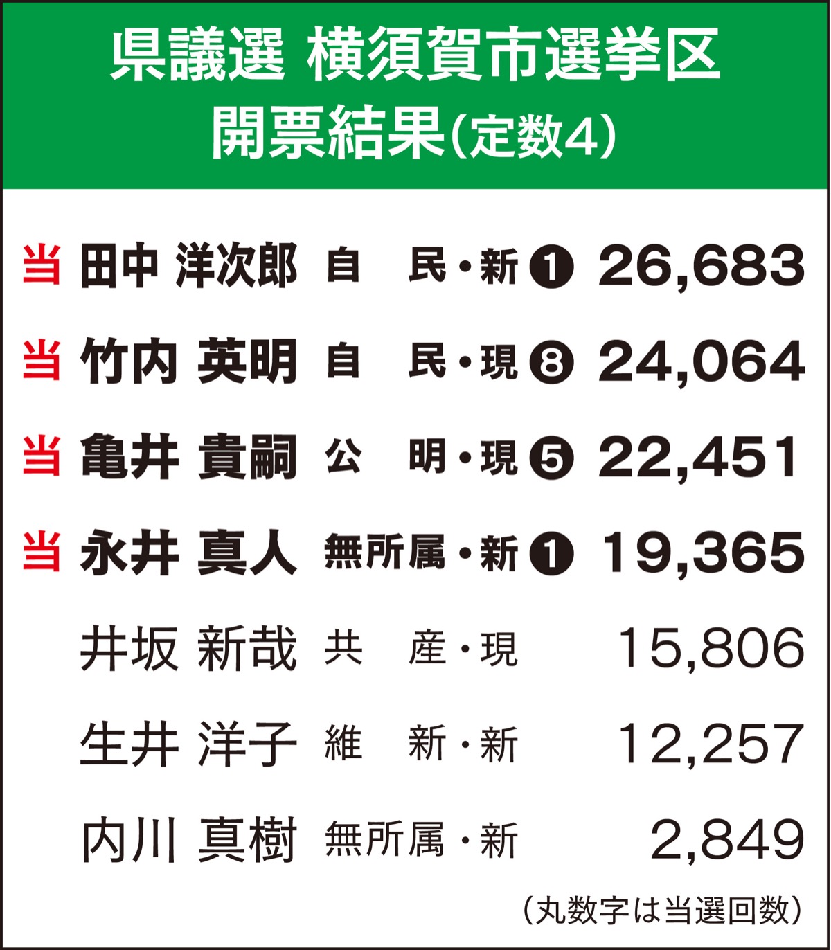 任期満了に伴う神奈川県議会議員選挙が4月9日に投開票され、新たな顔ぶれが決まった。横須賀市選挙区は今回から1議席減り、定数4に対して7人が出馬する激戦区。”舌戦”を繰り広げ、現職2人と横須賀市議会議員から鞍替えした新人2人が当選した。