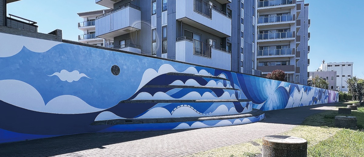 「よこすか海岸通り」(小川町〜平成町〜三春町付近)一角、海辺つり公園向かい付近の歩道に、全長70mの大規模壁画が完成した。通り一帯に点在する老朽化したモニュメントにアーティストがデザインの再構築を行い、個性的な景観を創り出す横須賀市のストリートキャンバス事業の一環。壁画アーティストとして活動する男女2人のユニット、HITOTZUKI(ヒトツキ)が手掛けた。