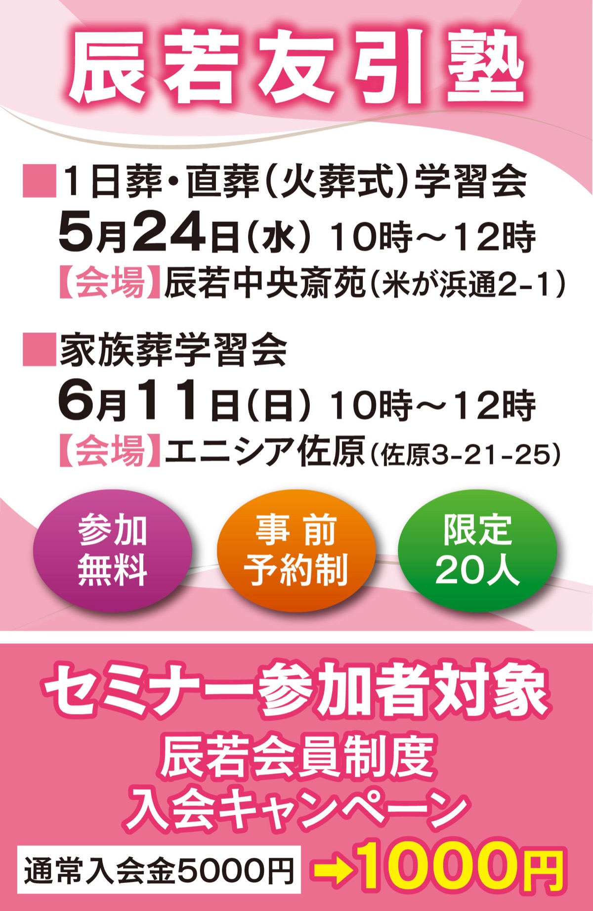 地元葬儀社の辰若では、「家族葬」と「1日葬」「直葬」をテーマにした無料学習会を開催する。それぞれの葬儀の形式や流れ、気になる費用に加えて、メリット・デメリットを正確かつ分かりやすく伝える。日時と会場は上表参照。
