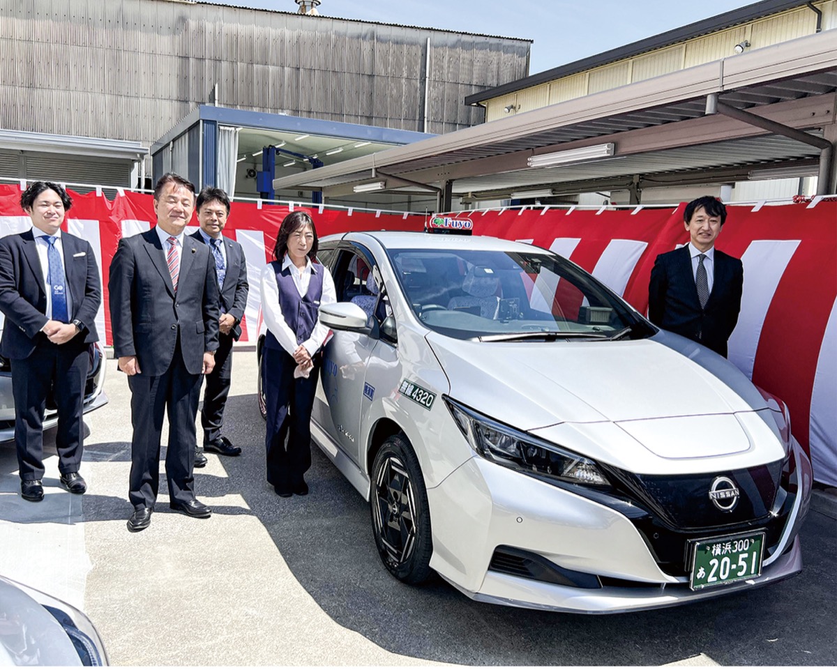 芙蓉交通株式会社(八木達也社長)は5月9日、同社で初の電気自動車(EV)タクシーの運用を開始した。同日には内川にある同社車庫で出発式が行われた。