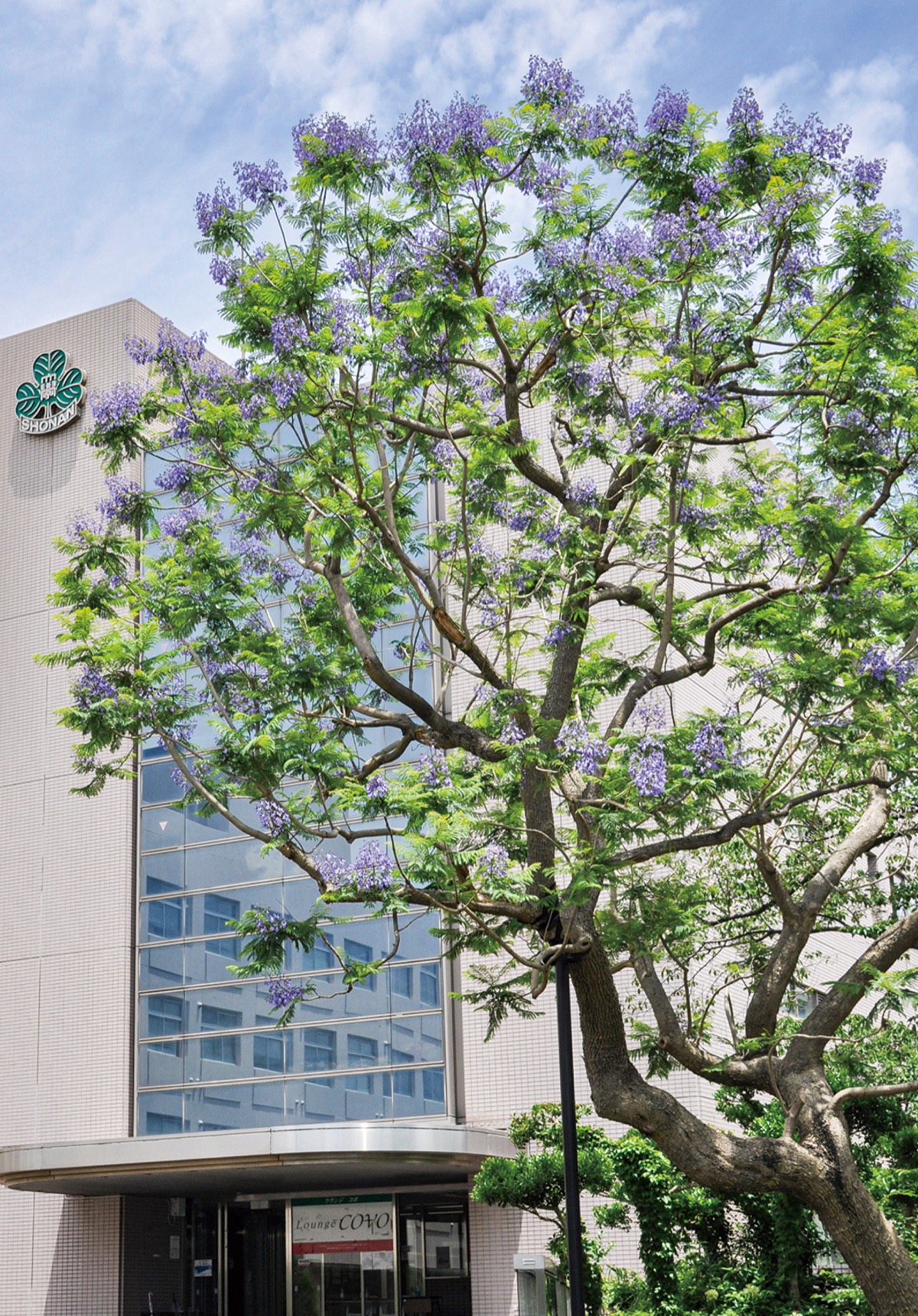 ジャカランダはブラジルの国樹でもあり、熱帯地方に分布。国内では九州など比較的温暖な地域で栽培例があるが、同大では気候や日当たりに恵まれるなどの条件がそろい、2本の木が毎年花をつけている。同大の関係者によれば、温暖化の影響で開花時期が少しずつ早まっているという。