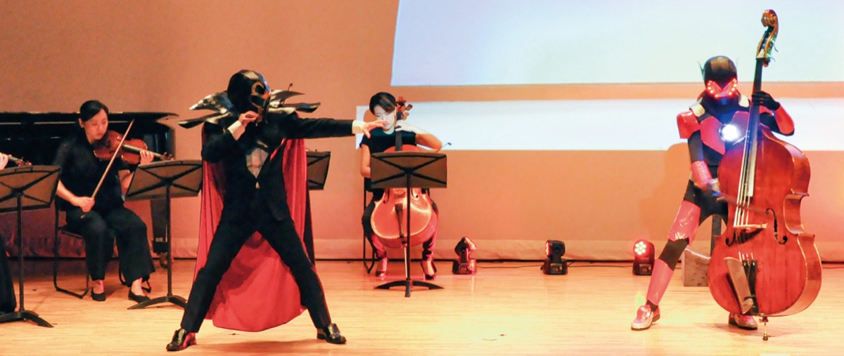 本格クラシックの演奏とヒーローショーという斬新な組み合わせの舞台「コントラバスヒーロー」が6月10日、横須賀総合高校SEAホールで開かれた。同校PTA文化委員会の主催。生徒と保護者、学校関係者約150人が鑑賞した。