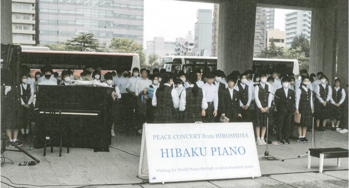 事前学習では被爆地としての広島の歴史を学び、一人一人が千羽鶴を作成。当日は降雨に見舞われながらも同校主催の「記念式典」を平和記念公園で開催。広島市の支援もあり、原子爆弾が投下された中で奇跡的に焼け残った「被爆ピアノ」が式典に貸し出された。生徒はそのピアノの伴奏に合わせ合唱や群読を行い戦争の悲惨さや「いま私たちにできること」に思いを巡らせた。