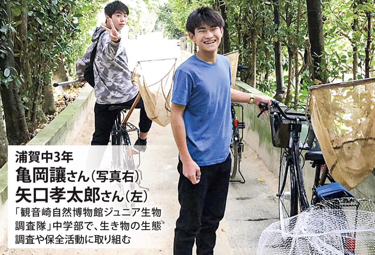 三浦半島を中心としたフィールドワークを通じて、生き物や自然とのふれあいを楽しむ「観音崎自然博物館ジュニア生物調査隊」の中学部に所属し、生態調査や保全活動に力を注ぐ。亀岡讓さんも矢口孝太郎さんも、幼い頃からの生き物好きが高じて、小学校高学年から参加。雑木林へ分け入ったり、水辺で泥まみれになったり、砂浜を這いつくばったり--。夢中になって生き物を追いかけ続けている。