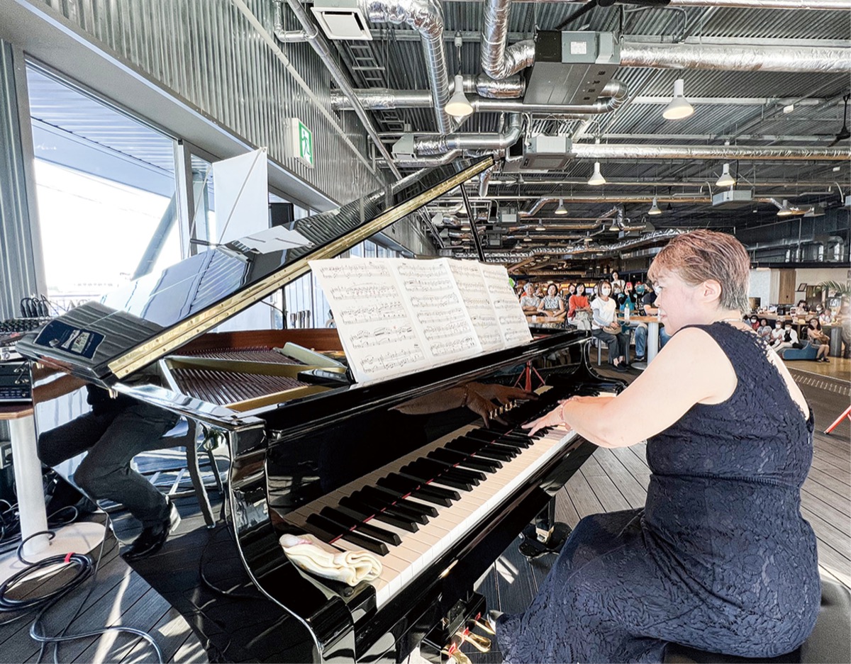 この日は、オープニングセレモニーとして横須賀出身のピアニスト、増田美穂さんが演奏を披露=写真。館内全体がクラシックの音色に包まれた。増田さんは同施設近くにある常葉中学校の卒業生。「X JAPANのギタリスト、hideとは同じ教室で学んだ同窓生。今日は一緒に演奏を届けたい」と話し、名曲「Forever Love」をしっとり奏でた。
