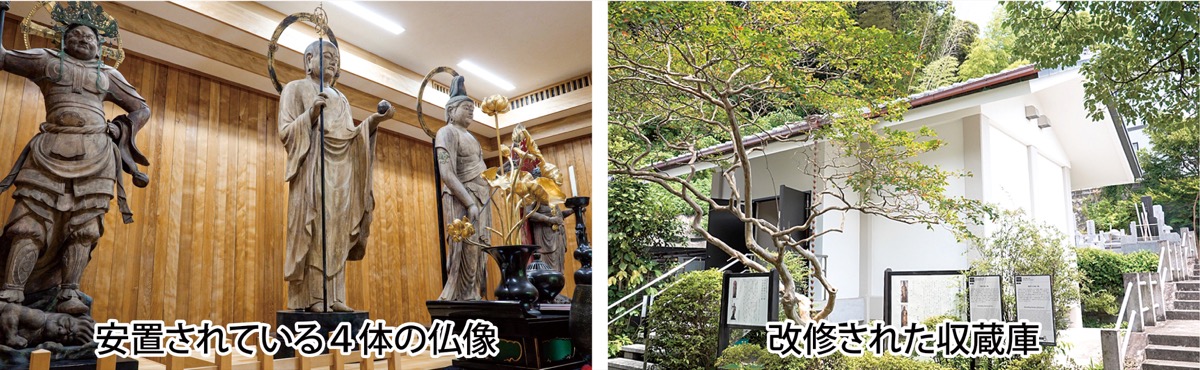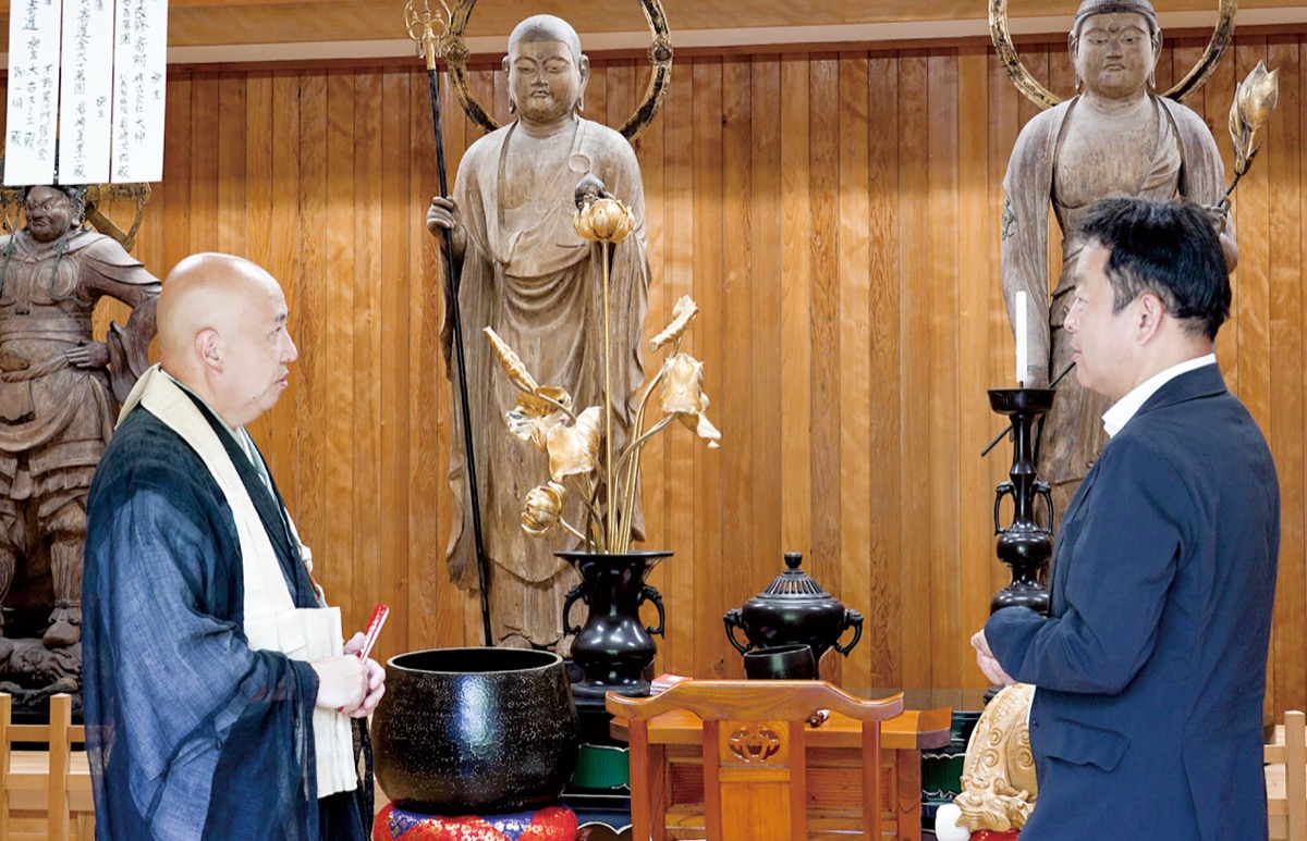 昨年のNHK大河ドラマ「鎌倉殿の13人」で注目を集めた三浦一族ゆかりの禅寺で、佐原義連が開基とされている満願寺(岩戸1の4の9)には、義連が自らの姿を彫らせたとも伝わる観音菩薩立像と地蔵菩薩立像が安置されている。国の「重要文化財」指定を受ける、これら”日本の宝”を収める収蔵庫の改修工事が約50年ぶりに行われ、地元横須賀の建築総合プランナー「大神」が施工を担当した。今回の工事に至る経緯、仏像を保存して後世に伝える意義などを同寺の永井宗直住職と同社の岩崎次郎社長が意見を交わした。