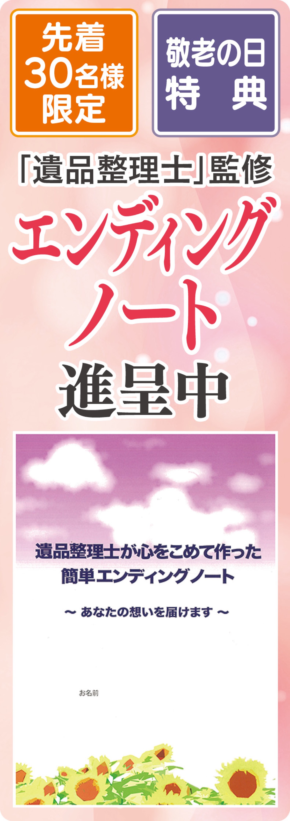 現在、敬老の日特典として遺品整理士認定協会監修の「エンディングノート」を先着30人に進呈中。「万一に備えて情報や気持ちを整理できる」と好評で、希望する市内の自治会や町内会にも毎年無料で配布し、今年は約30カ所に届けたという。詳細は同社【電話】046・887・0702(午前9時〜午後5時 (日)(祝)除く)【URL】https://yokosuka-ihin.com/