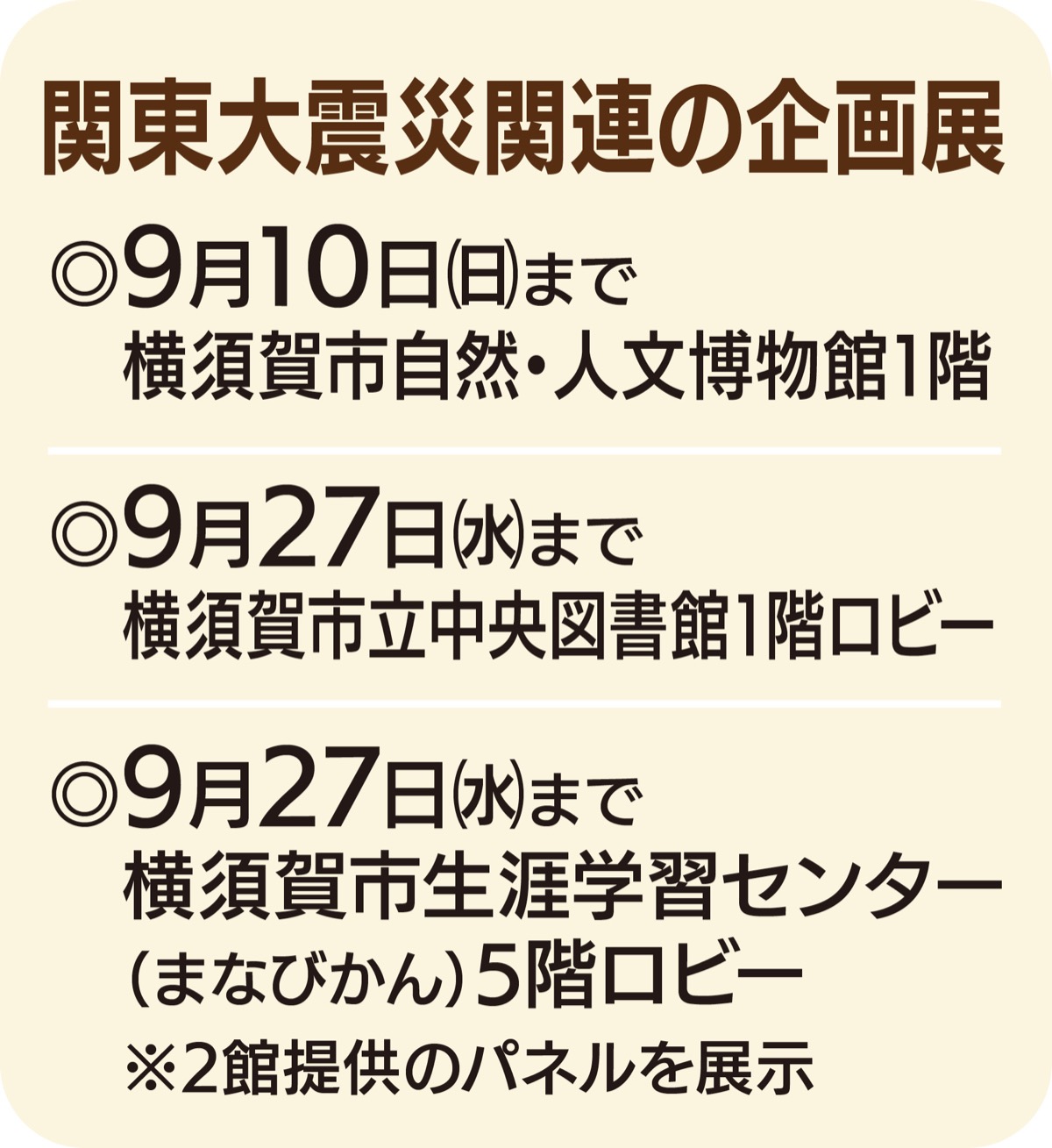 現在、横須賀市自然・人文博物館1階で開かれているトピックス展示では、飛行艇が見晴山上空から震災後に撮影したパネル写真も展示され、横須賀海軍軍需部の倉庫も損壊する被害を受けた様子が見て取れる。