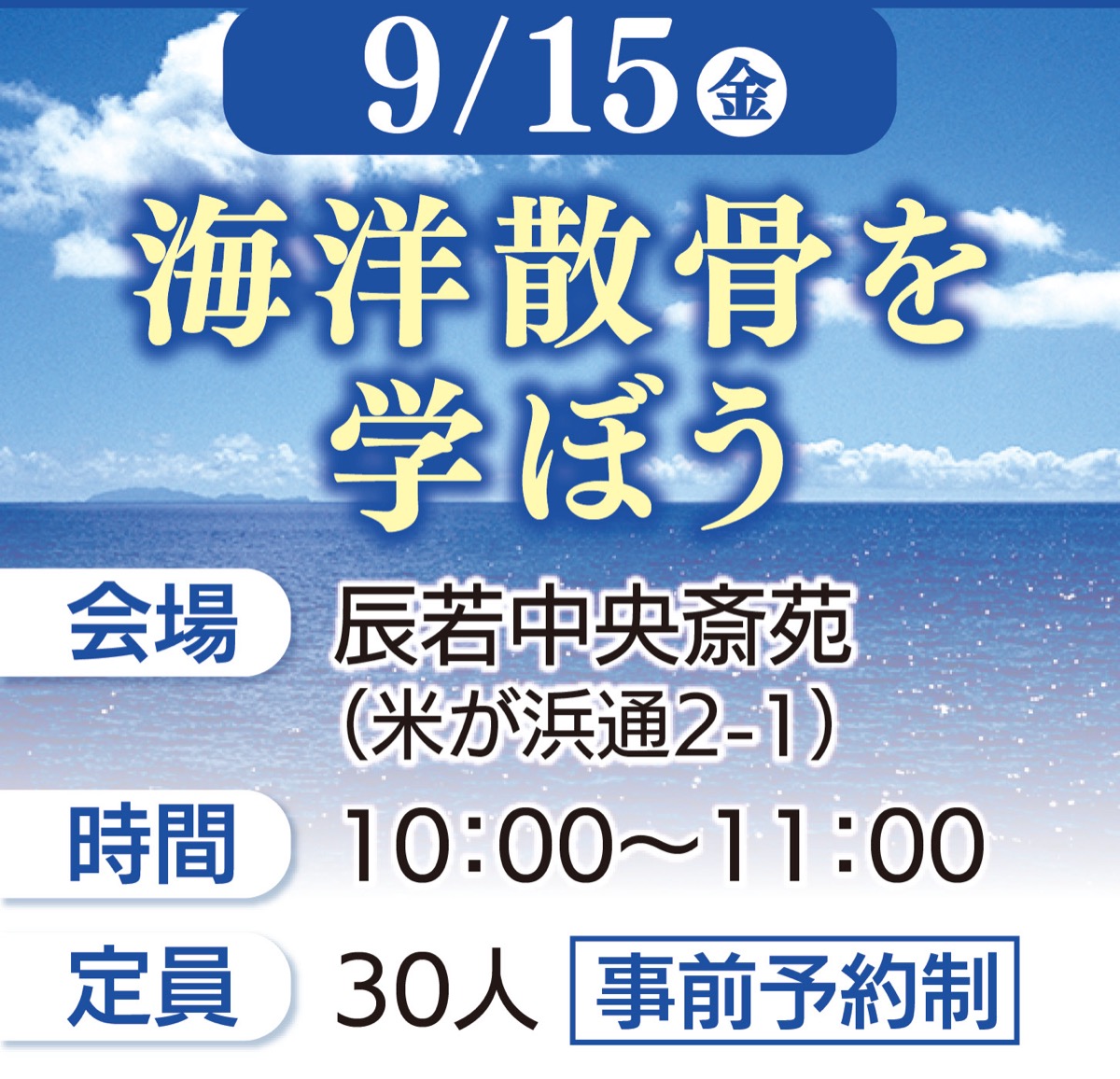 地域密着の辰若葬儀社では9月15日(金)、海洋散骨についての理解を深める無料学習会を開く。