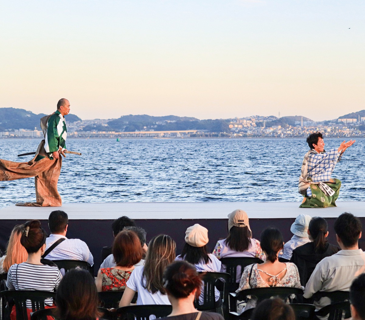 9月9日には、同公園では初となる狂言の舞台が開かれた。「萬狂言」から河野佑紀さんと石井康太さんを迎え、演じたのは「盆山」と「魚説法」の2演目。観覧客は夕焼けと海を背景に、非日常感を味わった。