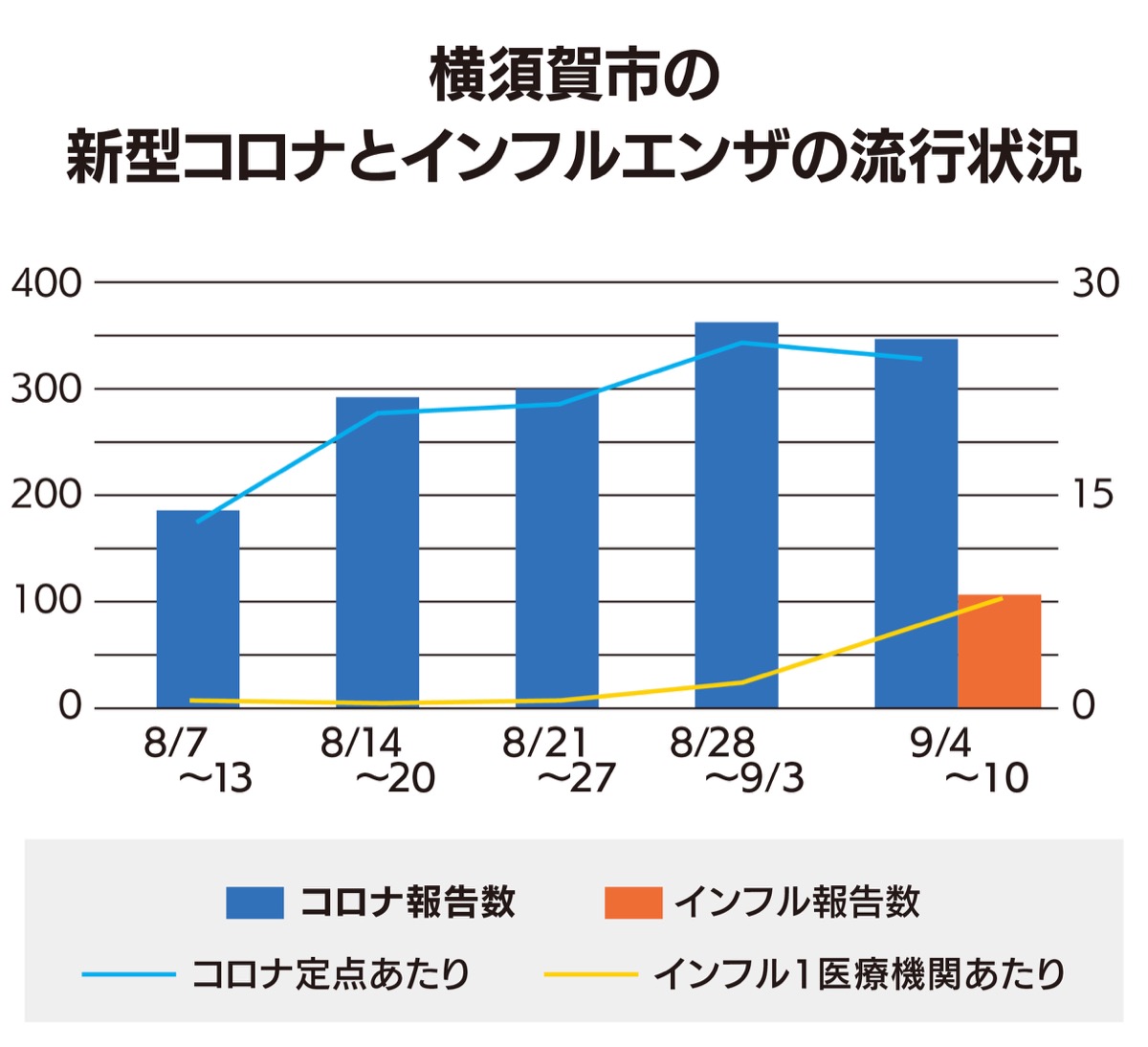 横須賀市内では、新型コロナウイルスの感染者が再び増加傾向にある中、8月末頃からインフルエンザの感染も広がり、同時流行している。