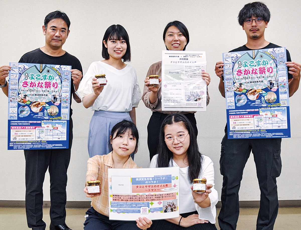 今回のイベントの目玉のひとつに、魚市場スタッフと近隣の神奈川県立保健福祉大学栄養学科の学生が共同で開発した地産地消のオリジナル商品がある=写真は開発メンバー。安浦港のタコと鴨居港のサザエを用いた「タコとサザエのオイル煮」だ。味はプレーンとトマトの2種類あり、瓶詰を数量限定で販売する。