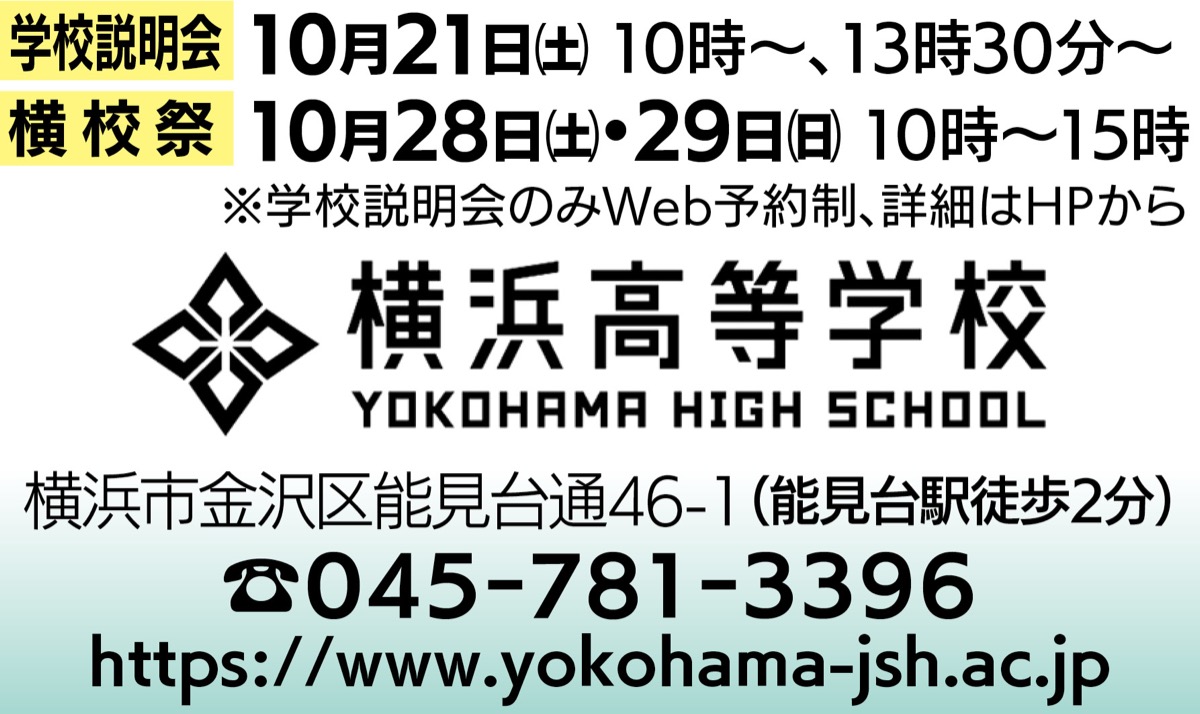 10月9日(月・祝)に横浜学園、横浜清風など横浜市内の私立高校7校が横浜高に集まる合同入試相談会を開く。午前10時から午後2時30分。また、28日(土)・29日(日)は「横校祭(文化祭)」を開催。どちらも予約不要、入退場自由。「活気ある明るい雰囲気をぜひ感じてください」と館山教頭。