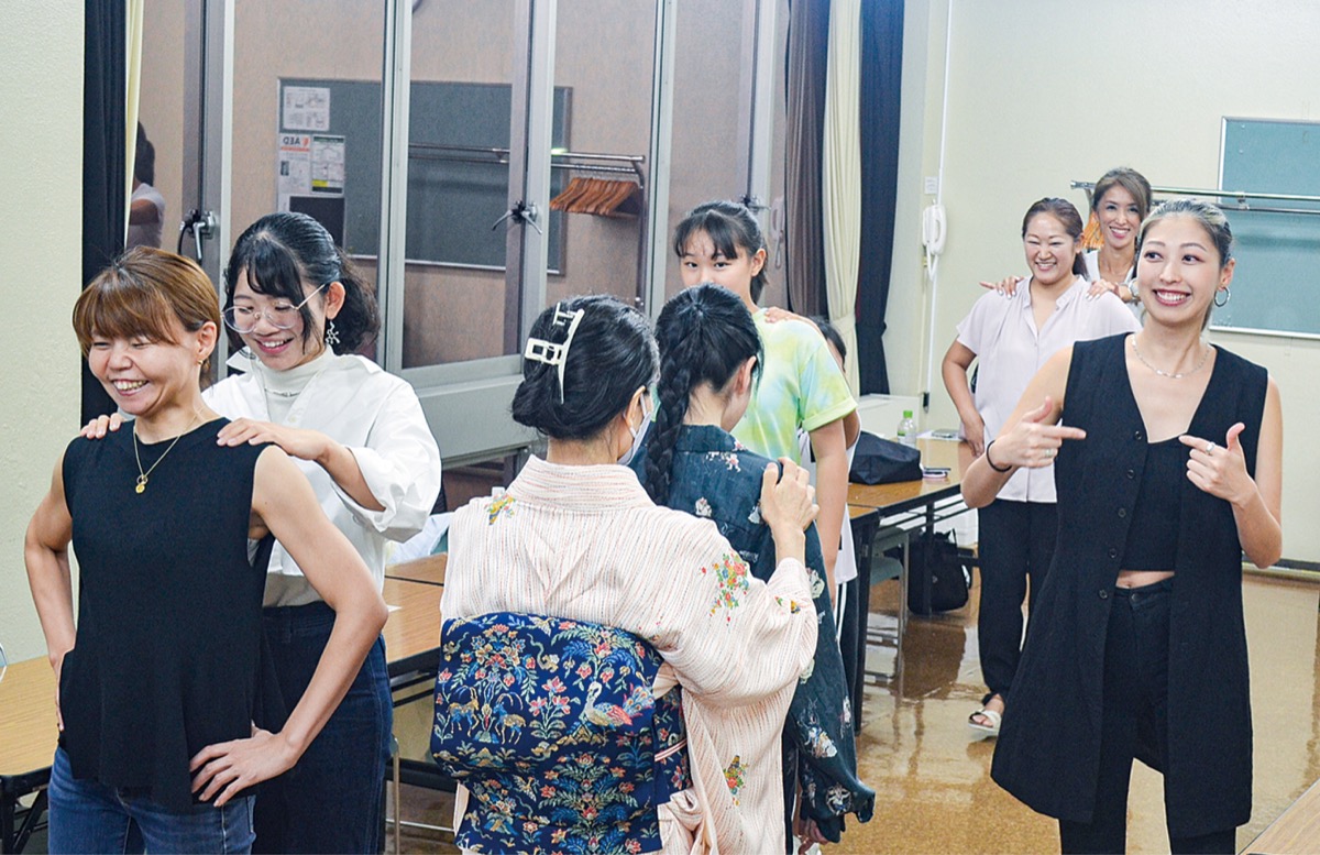 出演するのは市内在住の老若男女12人。本番を控えた9月30日にはモデルの塚本敦未さん(写真右)を講師として招いたウォーキング指導が行われた。レッスンは骨盤のストレッチから始まり、参加者はモデルウォーキングに必要な身体の使い方を実践を交えながら学んだ。