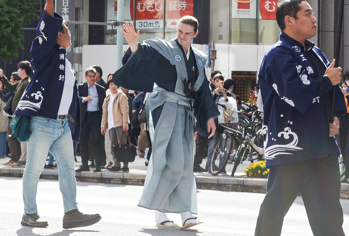 同パレードでは日本全国から参加する団体が各地の伝統文化や演舞を披露。「按針の会」からは同会メンバーのほか、NHK大河ドラマ『どうする家康』に三浦按針役で出演している村雨辰剛さん=写真中央=も隊列に加わり、観衆の注目を集めた。