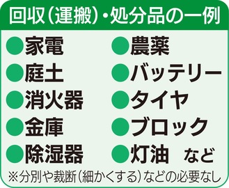個人法人問わず、月曜〜土曜まで持ち込み処分もOK。見積無料。支払いはクレジットカード、各種電子マネーも使用可能。(問)【電話】046・887・0702(午前9時〜午後5時/日祝除く)