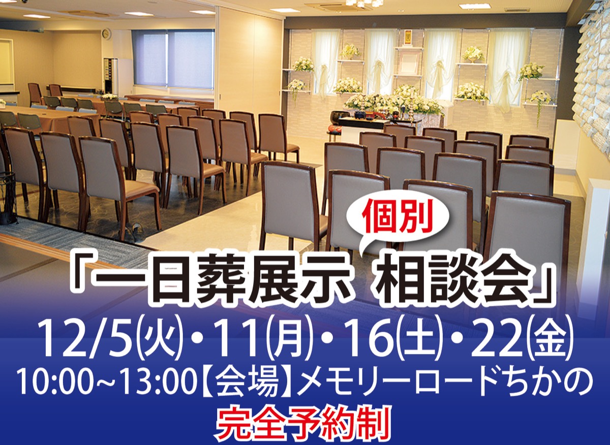 公郷町の近野葬儀社では、親族など近しい人のみで執り行う「家族葬」「一日葬」に関する無料展示相談会を開く。それぞれの違い、必要な準備と手続き、費用についての情報提供を行うことで、自分の人生の整理や家族の負担軽減につなげてもらう。会場は斎場メモリーロードちかの。