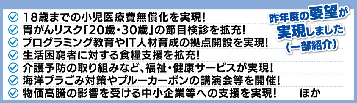 来年度の要望の一例として、移動支援制度改革の提言をはじめとする生活支援や多子世帯の保育料無償化などの子育て支援、物価高騰に対する経済対策、急傾斜対策、予防接種の助成制度、がん予防対策、福祉施設における人材確保策、保育士や幼稚園教諭の確保策、中心市街地の駅前再開発など、様々な項目を盛り込み、住みやすいまちづくりを実現するために要望しました。