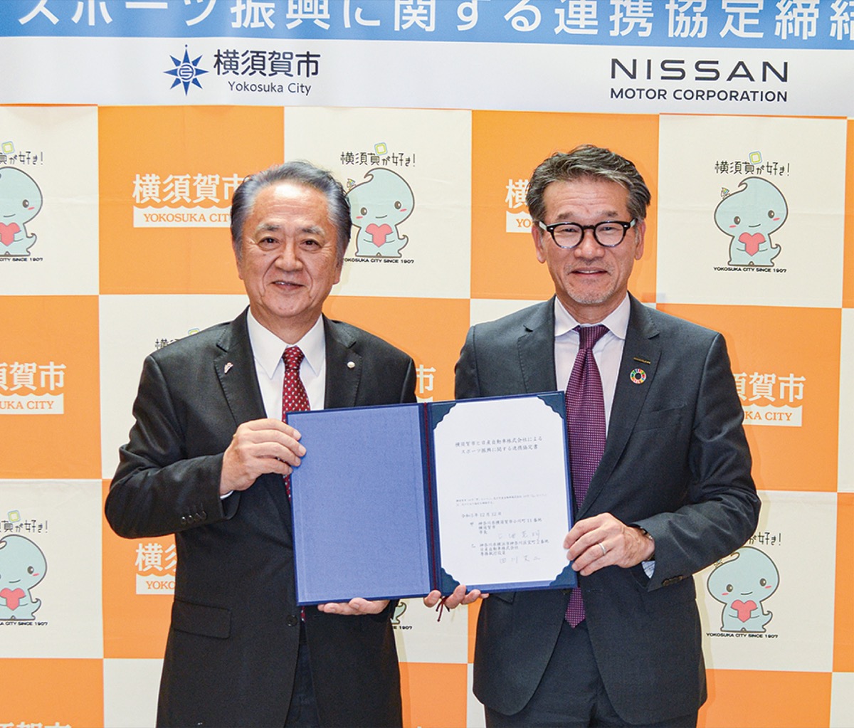 横須賀市と日産自動車(株)(本社=横浜市西区)は12月12日、「スポーツ振興に関する連携協定」を締結した。同社は今年9月に追浜を拠点とする硬式野球部の活動再開を決定。地域連携を強めることで、同市の「スポーツを核としたまちづくり」に寄与していく方針だ。