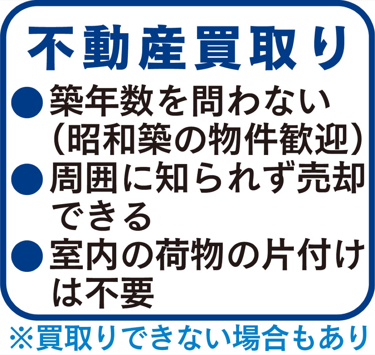 コロナ禍が落ち着いたことで不動産の中古市場が活況となり、紹介できる物件在庫が少なくなっている。建物は築年数の経過による汚れや傷みが目立つものでも査定が可能。物件の調査・査定費用は無料で、即金買取りも行っている。室内の家具や荷物もそのまま、面倒な片付けは不要だ。