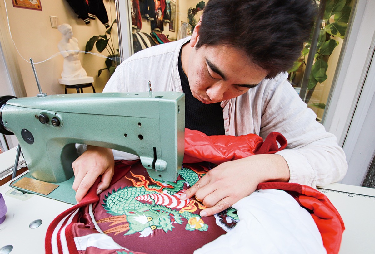 ドブ板通りの一角の店舗前に置かれたテーブルとミシン。興味を示した通行人が立ち寄り、職人が施す刺繍の繊細さと華麗さに目を奪われている―。ここはスカジャンと刺繍の専門店「ドブ板コーバスタジオ」(本町2の1)。店主の山上大輔さんは「今年の干支『辰』に合わせた注文が増えている」と話す。