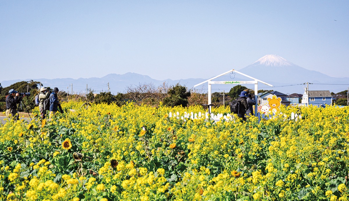 長井海の手公園 ソレイユの丘では、入園ゲートすぐ横の花畑で一足早い春を感じさせる菜の花が綺麗に咲き誇っている。晴れた日には富士山の姿も見ることができる。