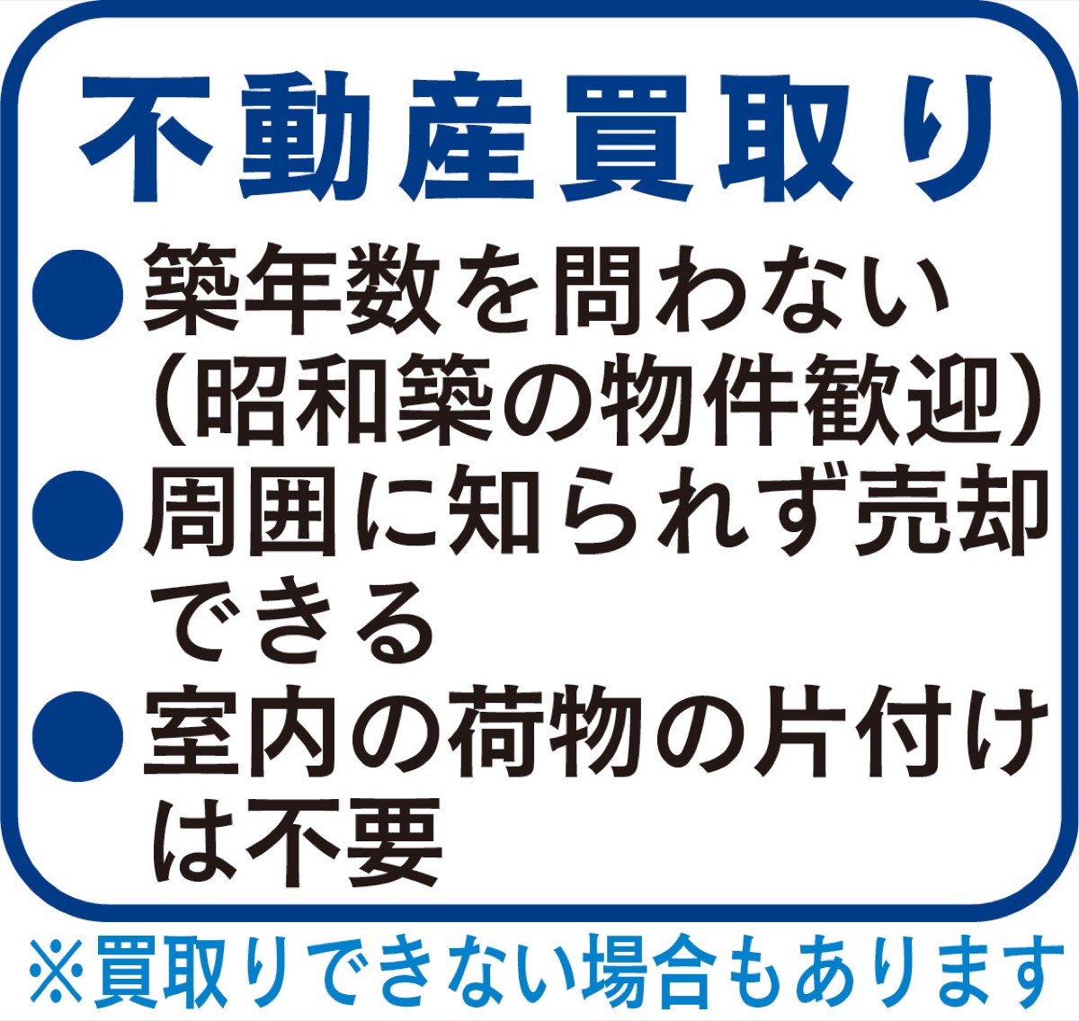 中古住宅の売れ行きが良く、中古市場が活況。紹介できる物件在庫が少なくなっているため、今は「売り手市場」と言える。建物は築年数の経過による汚れや傷みが目立つものでも査定が可能。物件の調査・査定費用は無料で、即金買取りも行っている。室内の家具や荷物もそのまま、面倒な片付けは不要だ。