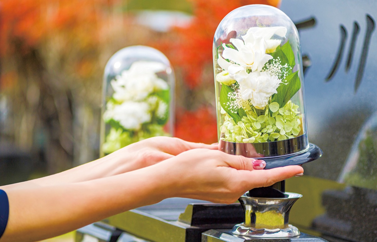 約半年間、美しさが続くフラワーアレンジメントを閉じ込めた高さ約30cmの専用花器を、墓石の花筒に挿し込むだけの手軽さもあって評判は上々。昨夏からは野比の最宝寺に設置する自動販売機でも取り扱いを始めたほか、横須賀市のふるさと納税の返礼品にも登録され、昨年1年間で約100個を売り上げたという。販売は1対1万5千円(税込)〜、同社HPなどで購入できる。