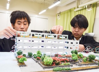 同校の「課題研究」では、普段カリキュラムが分かれている各科からテーマごとにメンバーが集まり、共同で一つの取り組みを行う。校舎模型の製作においては、電気科がLEDを用いた電飾の整備、化学科が校舎各部の塗装、機械科が校舎内部の備品を3Dプリンターを用いて作成した。来年度は2022年度に新設された建設科も学習に加わる。